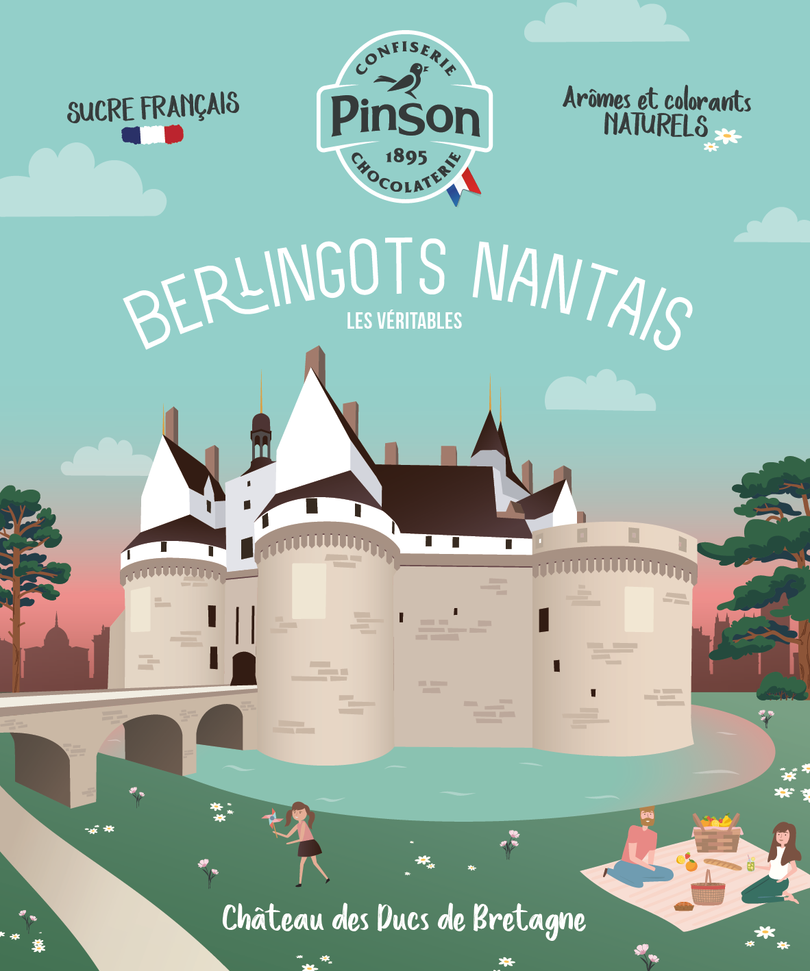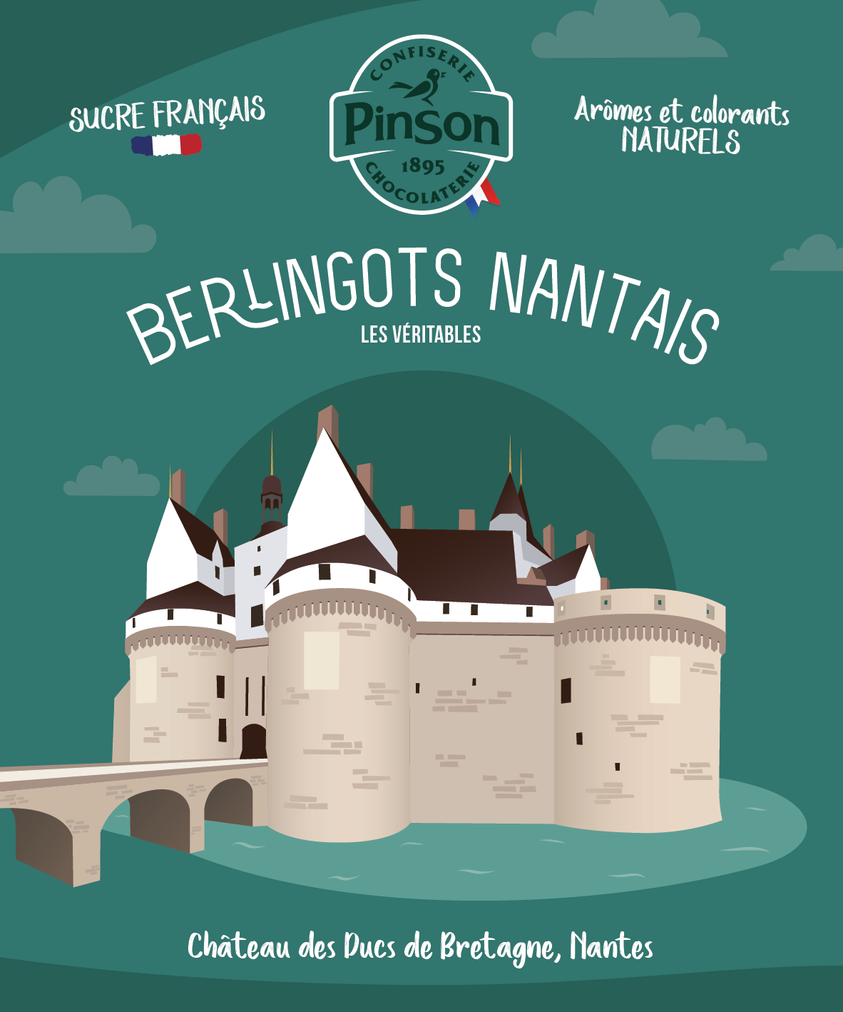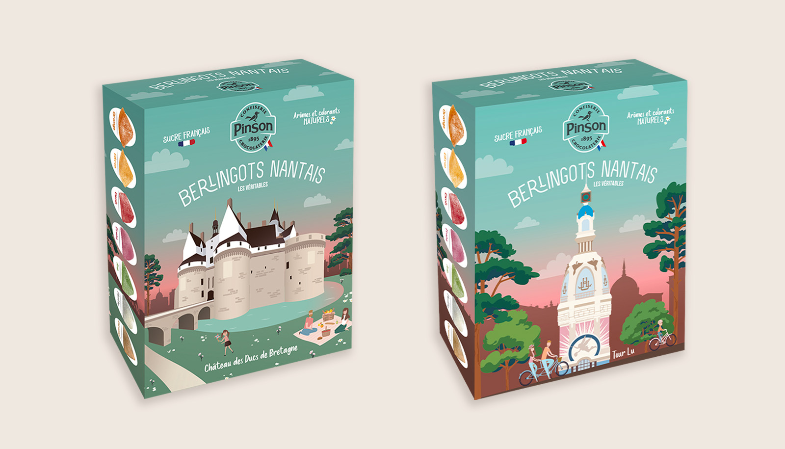 Pour la Confiserie Pinson, j’ai imaginé et réalisé le design de packagings de berlingots nantais, mettant en avant des lieux emblématiques de la ville de Nantes.